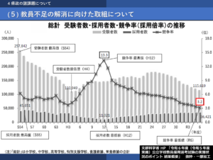 教員不足を解消するためには、採用試験における受験要件の緩和とともに、働き方改革により教員が働きやすい学校をつくる取組が不可欠です。