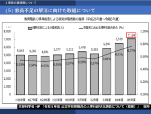 教員不足を解消するためには、県教育委員会として、教員の働き方改革を進めていくことを明確に打ち出し、しっかりと取組を進めるとともに、教員採用試験の応募者増加に向け、さらなる試験制度の見直しに取り組んでいく必要がある。
