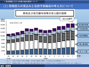 はじめに、県税収入ですが、賃上げ、株価の上昇や、7年3月期の企業収益が最高益となる見通しから、個人県民税と法人二税の増収が見込まれます。